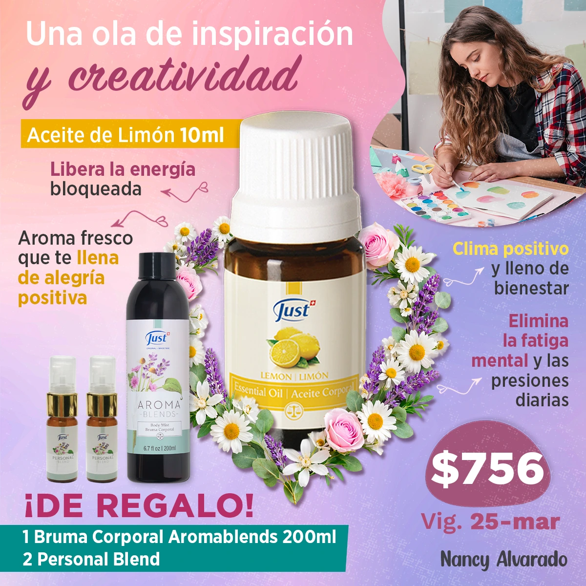 - Disfruta de múltiples maneras los beneficios que la Aromaterapia Just tiene para ti (usa difusores, rocía en pañuelos, almohadas, cuerpo y ambiente, masajes, inhalaciones, baños, compresas, buches)
